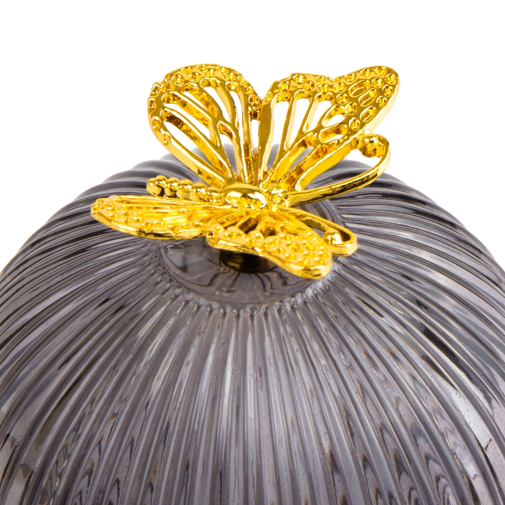 Скляна скринька з метеликом - елегантне та стильне рішення для естетичного зберігання прикрас та інших важливих дрібничок. Це справжнє поєднання якості, естетики та функціональності. Скринька виготовлена з увагою до деталей, з високоякісного прозорого скла, що захищає прикраси від пилу, вологості та інших негативних факторів, що можуть вплинути на їхню якість та вигляд. Закривається скринька за допомогою скляної кришки, що декорована металевим золотим метеликом. Ретельно відшліфовані кути та відблиски світла додають шикарності цій скриньці, нагадуючи про красу коштовностей, які вона приховує. Діаметр скриньки - 9,5 см, висота - 16,5 см. Запакована у білу картонну коробку.