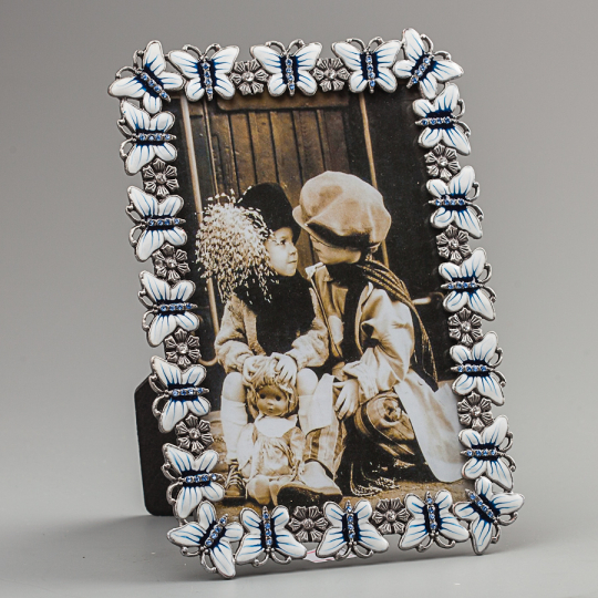 Фоторамка "Метелики" інкрустована камінням та ювелірною емаллю, з детальним опрацюванням деталей. Стане чудовим елегантним подарунком, що запам'ятовується. Фоторамка це чудовий спосіб створити затишну атмосферу в будинку, створити неповторну та оригінальну деталь інтер'єру та радувати око важливою подією чи людиною на фото. Якщо ви не знаєте, що подарувати, то фоторамка – відмінний варіант. Виберіть фото, на якому ви з винуватцем урочистості, вставте його в цю рамку та подарунок готовий. Розміри рамки 13*18 см, фотографія 10*15 см.