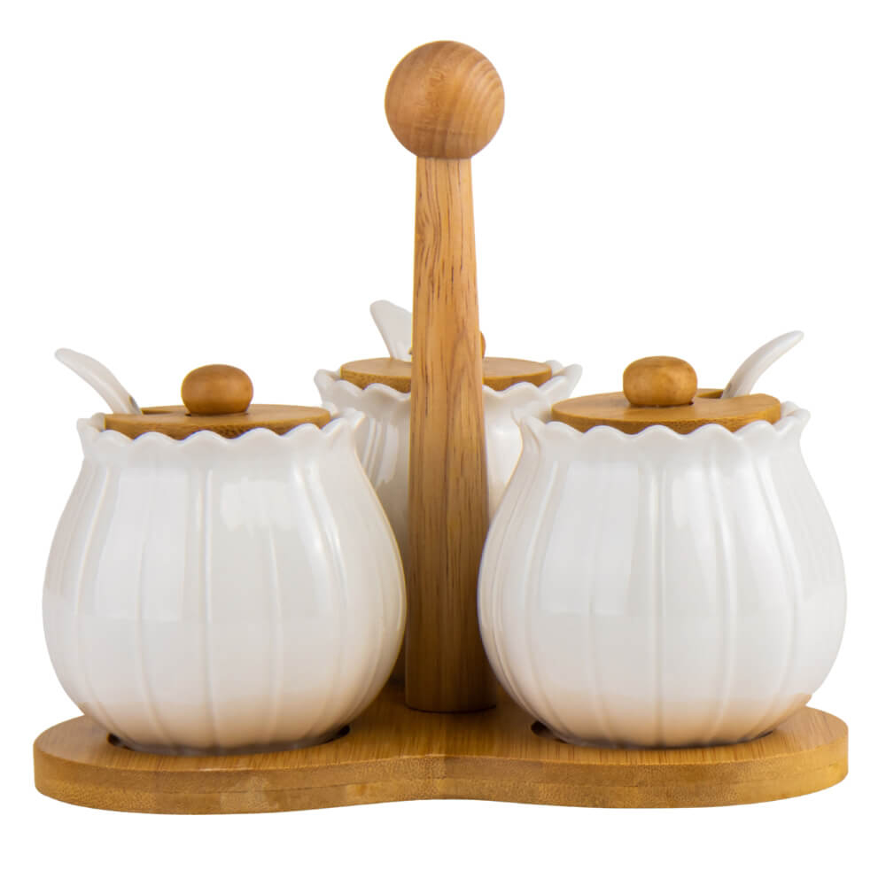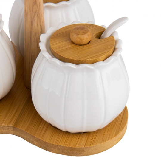 Ємності для зберігання з бамбуковою кришкою є практичними та стильними рішеннями для зберігання різних сипучих продуктів, таких як цукор, сіль, спеції тощо. Ємність виготовлена із кераміки білого кольору. Бамбукова кришка добре прилягає до банки, забезпечуючи герметичне зберігання від пилу і вологості, забезпечуючи при цьому легкий доступ до них. Окрім практичності, така мінімалістична ємність також вносить естетичний елемент в декор вашого простору. Висота підставки - 17,5 см. Діаметр спецівників - 8 см, висота з кришечкою - 9 см. Довжина ложки - 11 см.