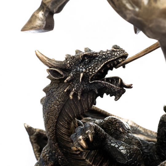 Статуетка «Георгій Побідоносець» уособлює собою одного з найбільш шанованих в християнстві великомучеників. Це покровитель всіх воїнів, заступник рідних. Виріб виготовлено з полистоуна (штучний камінь), покрито напиленням з бронзи; і упаковано в подарункову коробку, що надає йому престижність і розкіш. Завдяки надійній упаковці, виготовленої з пінопласту з заглибленнями для самих маленьких деталей, Ви можете бути впевненими в безпеці при транспортуванні.
