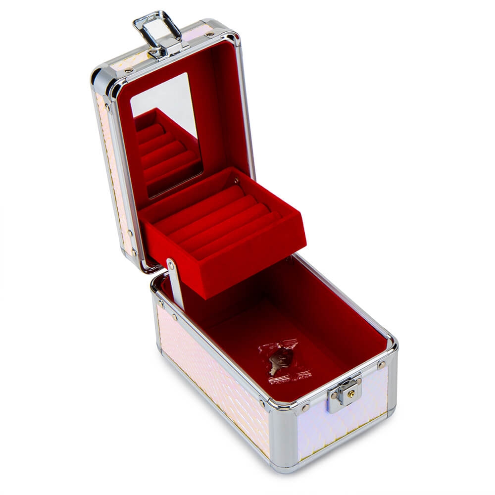 Кейс-скринька стане оригінальним і дійсно необхідним подарунком для дівчаток різного віку, адже кожна хоче гарно зберігати косметику, аксесуари і важливі дрібниці. Це також прекрасний варіант для зберігання всього необхідного для візажистів, майстрів краси, адже скринька має зручну металеву ручку і достатню кількість відсіків. Цей стильний виріб ретельно зберігатиме весь вміст. Шкатулка виконана зі шкірозамінника і металу, зачиняється на замку, має зручну металеву ручку і ключ.