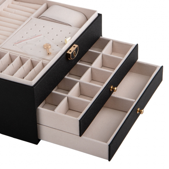 Висота скриньки - 14 см, довжина - 23,5, ширина - 17,5 см. Запакована у крафтову коробку. Скринька для прикрас - це стильний варіант для зберігання улюблених аксесуарів. Виконана з екошкіри, всередині є багато зручних відділень для різних видів прикрас, таких як каблучки, сережки, браслети тощо, що допомагає зберігати їх в порядку та безпеці. Крім того, скриньку з екошкіри легко чистити і доглядати, що робить їх практичними та зручними для використання у повсякденному житті. Скринька має унікальний, привабливий дизайн і виконана з великою увагою до деталей.