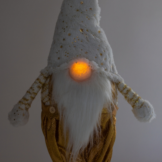 Ніс гномика з підсвіткою. Шапка гнучка. М'яка текстильна новорічна іграшка – це чарівний декор для святкового інтер'єру, виготовлений з м'яких і приємних на дотик матеріалів. Ніжні кольори та деталі додають їй особливого шарму та святкового настрою. Іграшка ідеально підходить для прикрашання ялинки, каміна, або використання в якості подарунка, що принесе радість та затишок у кожен дім. Фігурка стійко стоїть.