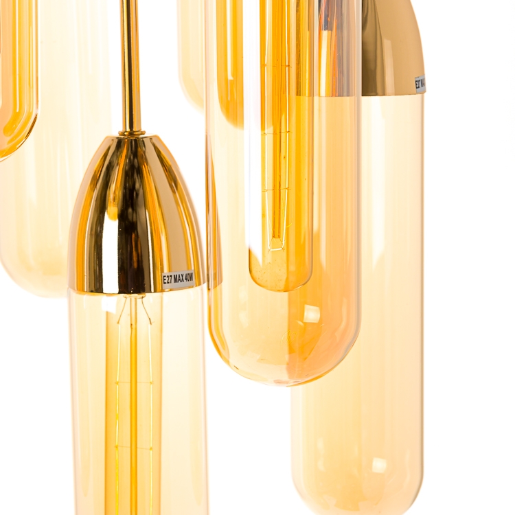 Стиль - Модерн; Кількість плафонів - 7; Колір плафонів - Медовий; Джерело світла - E27; Висота, см - 85 Тип кріплення - Монтажна планка; Ширина, см - 30; Матеріал плафонів - Скло; Матеріал арматури - Метал; Колір арматури - Золото, Кришка - 13см