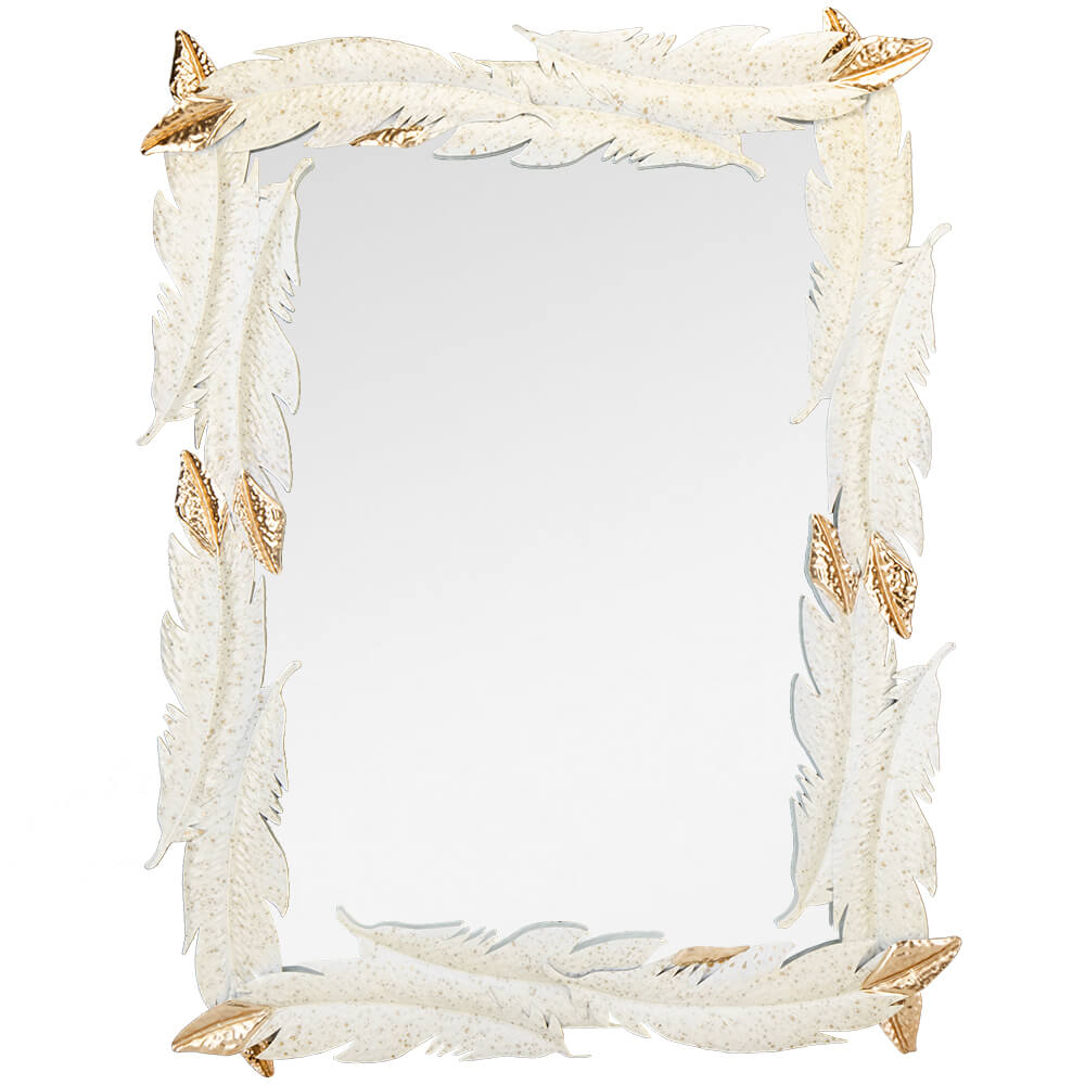 Современное настенное зеркало выполнено из металла. Это настоящее украшение для вашего дома - в спальне, гостиной или прихожей настенное зеркало будет выглядеть очень изысканно! Зеркало украшено белыми листьями с позолотой. Высота настенного зеркала – 100 см, ширина – 70 см.